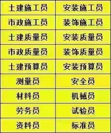 施工员、质量员、预算员、测量员、劳务员、试验员、材料员、标准员、资料员(城建档案员)机械员